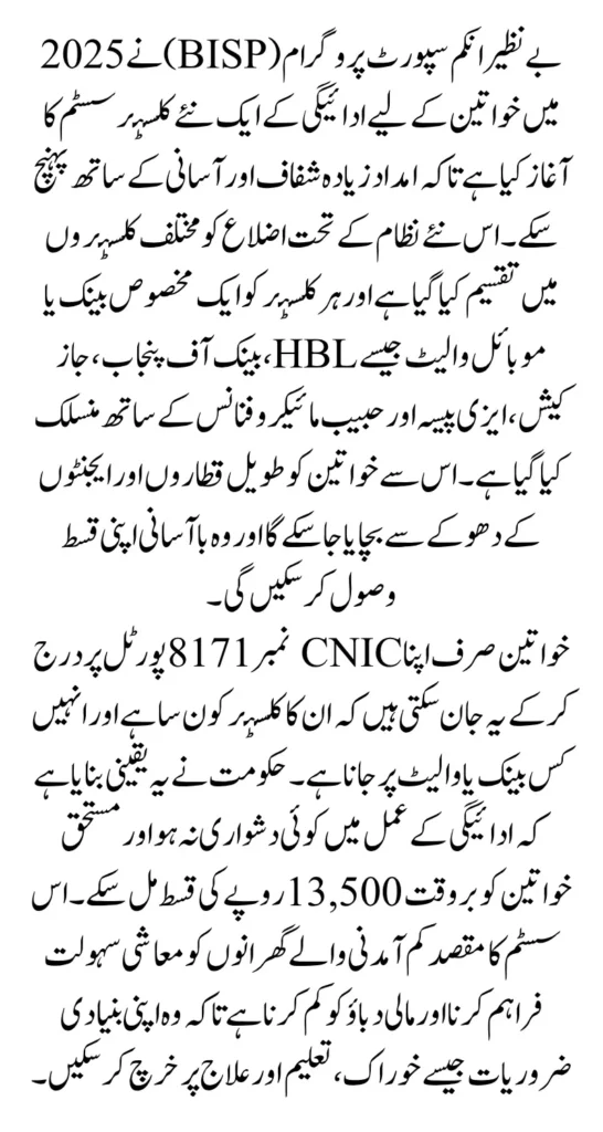 BISP 2025 Payment Cluster Distribution is one of the most significant welfare initiatives in Pakistan, offering direct financial aid to millions of low-income families. In 2025, the government has officially increased the installment amount to Rs. 13,500 per family, ensuring that more women can provide food, education, and healthcare for their children without constant financial stress. This step is not just about increasing the amount but also about ensuring that the payment reaches the right people in the safest and most transparent way possible.